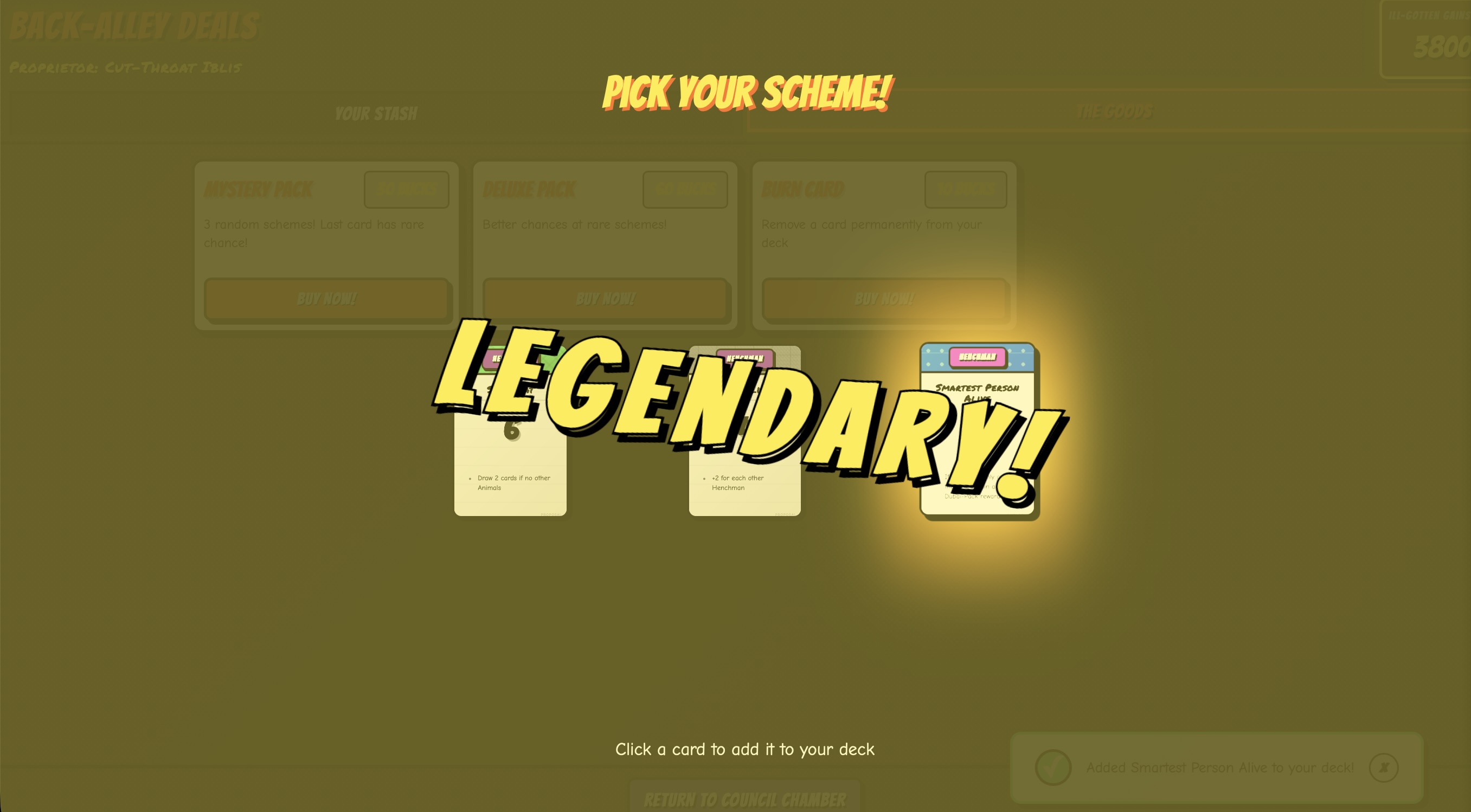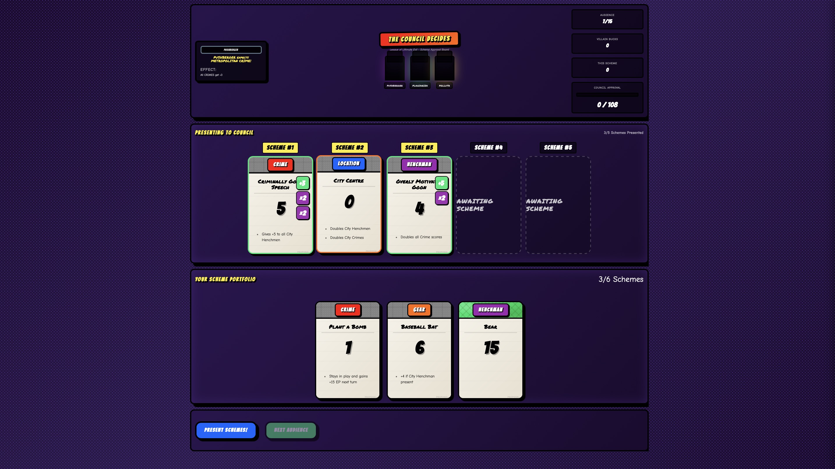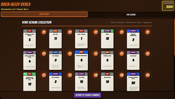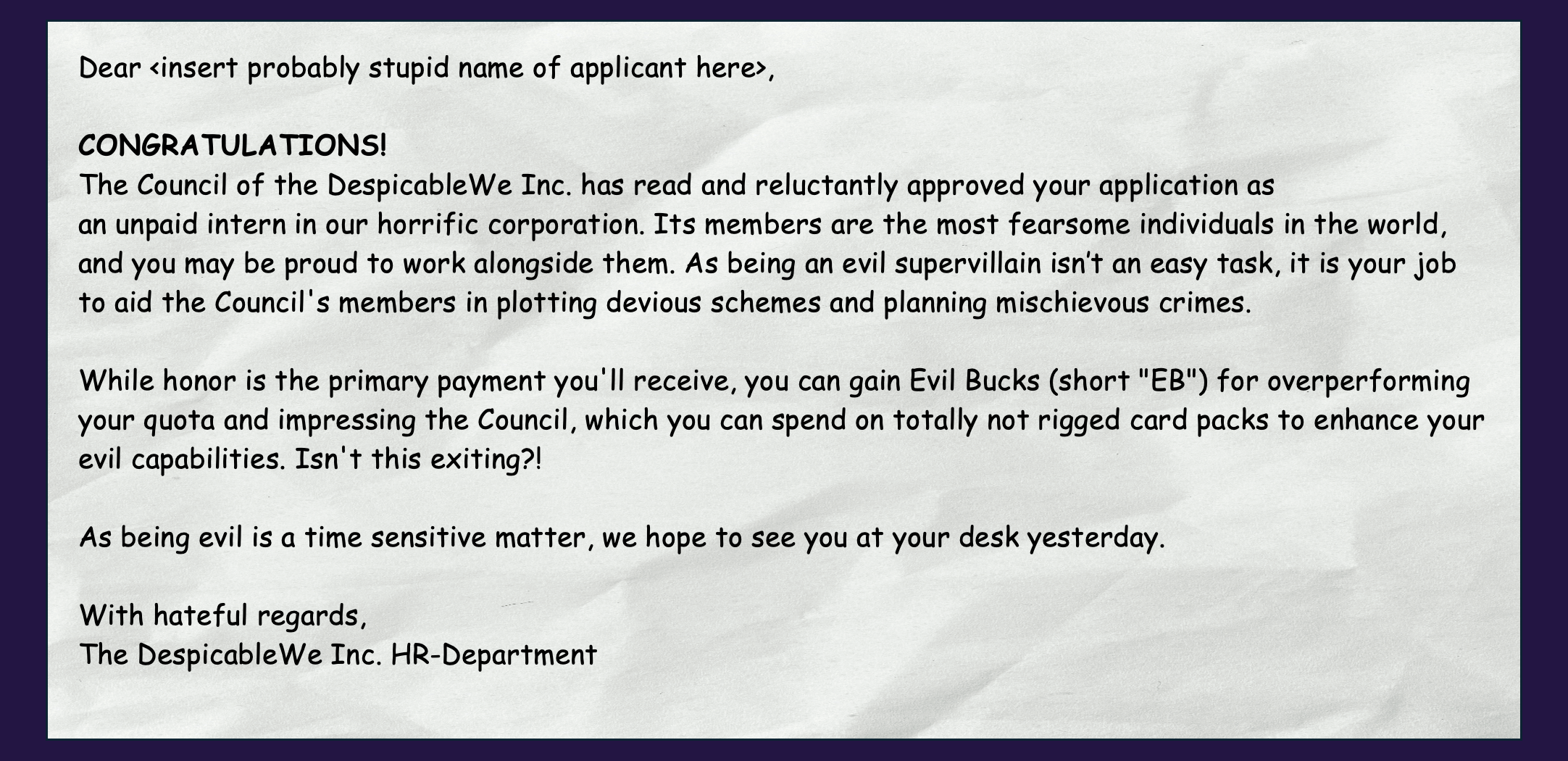 Evil (The) Gathering is a deck builder with roguelike and pack opening elements. As an intern in the DespicableWe Inc., you are tasked with plotting evil schemes for the Council members. For this, you'll have a wide range of card types at your disposal. Each card has an Evil Value (called "EP" for "Evil Points") as well as a unique card effect. In order to assemble the ultimate plan, you'll have to combine your cards in clever ways to activate combos that can give EXORBITANT amounts of points. But beware: every 5 turns a quota has to be met in order to progress. If you fail, you're out. But if you surpass your given quota, a nice bonus waits for you, which you can spend for card packs, containing more – maybe even Legendary – new cards for your deck.