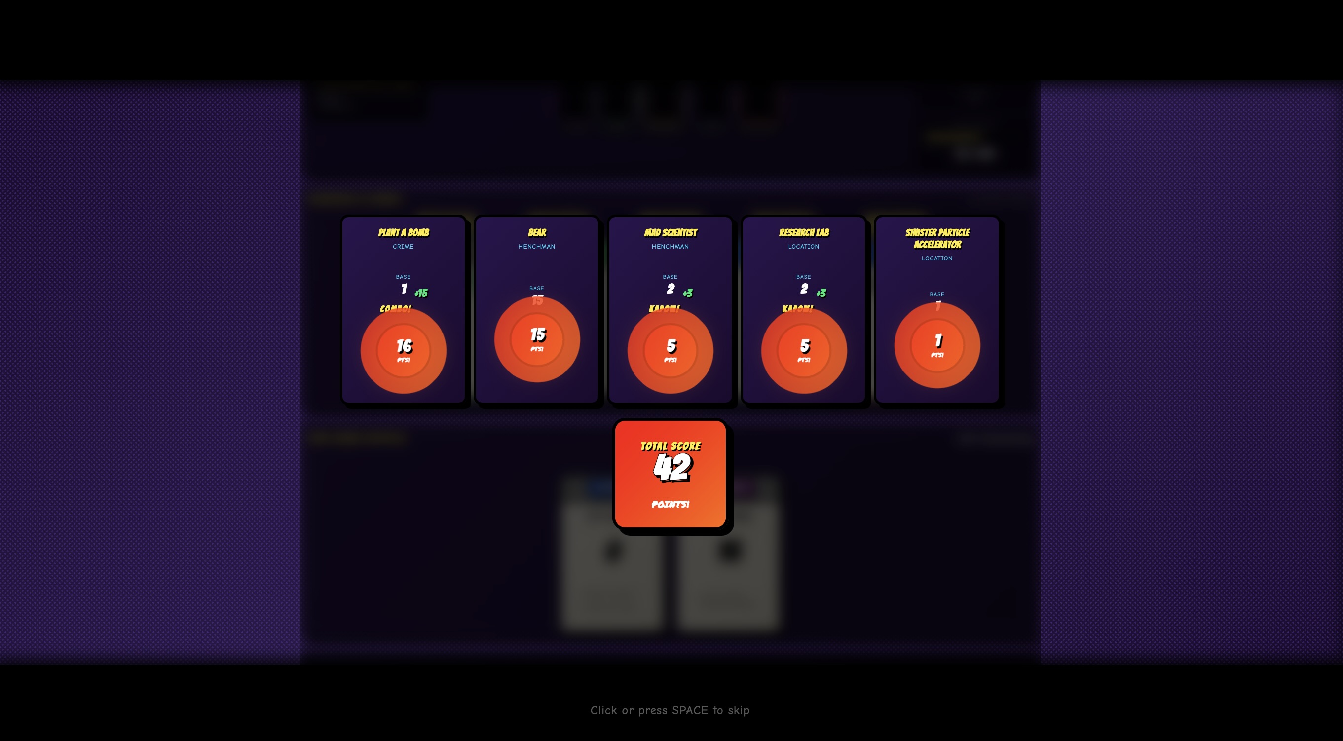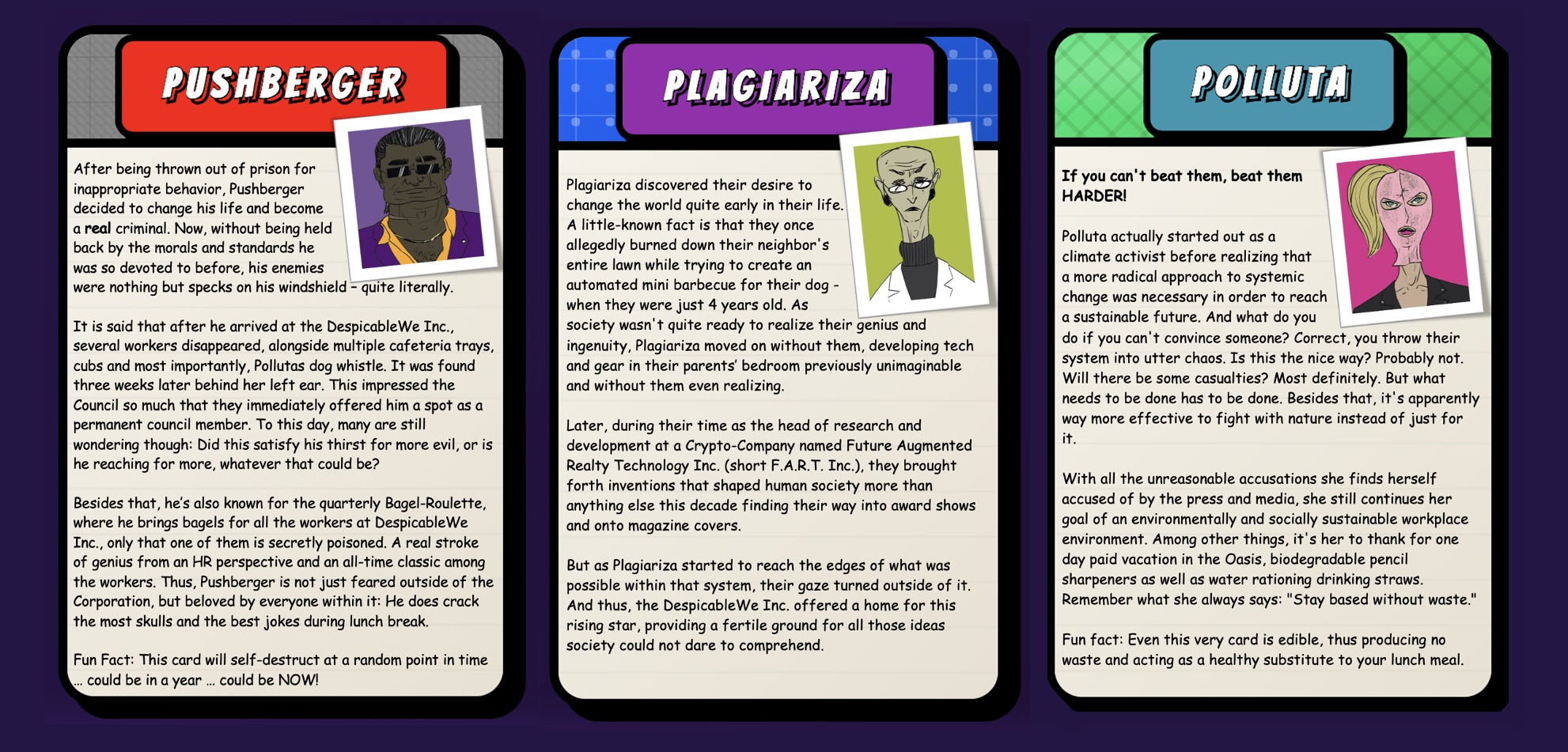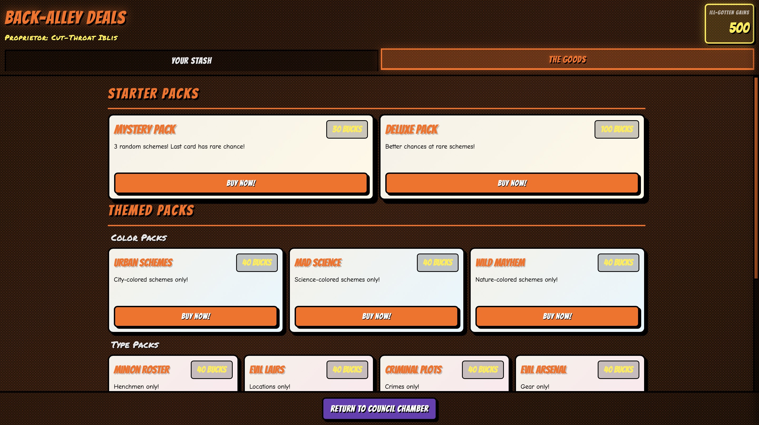 Evil (The) Gathering is a deck builder with roguelike and pack opening elements. As an intern in the DespicableWe Inc., you are tasked with plotting evil schemes for the Council members. For this, you'll have a wide range of card types at your disposal. Each card has an Evil Value (called "EP" for "Evil Points") as well as a unique card effect. In order to assemble the ultimate plan, you'll have to combine your cards in clever ways to activate combos that can give EXORBITANT amounts of points. But beware: every 5 turns a quota has to be met in order to progress. If you fail, you're out. But if you surpass your given quota, a nice bonus waits for you, which you can spend for card packs, containing more – maybe even Legendary – new cards for your deck.